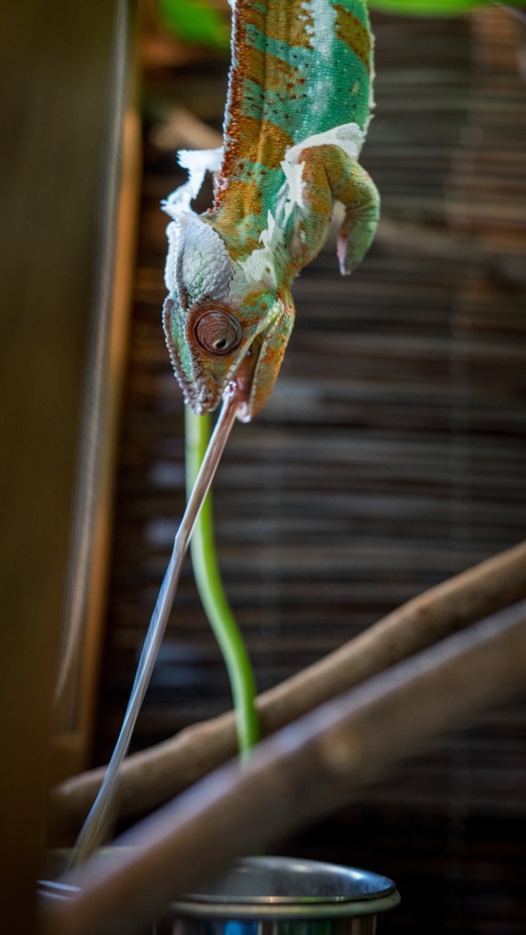 Info pratique pour partir en vacances : un caméléon adulte (disons à partir d’un an pour simplifier) peut sans problème jeûner une semaine s’il est en bonne santé et qu’il a accès à de l’eau.