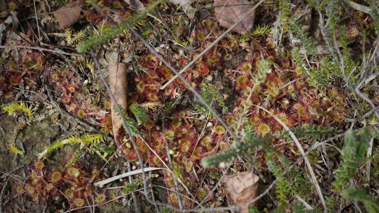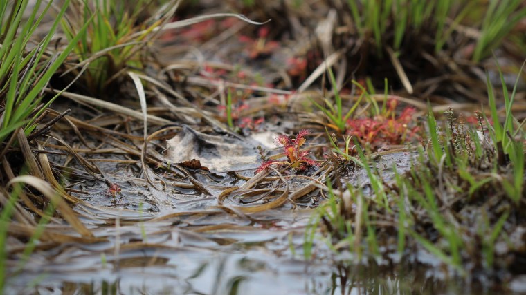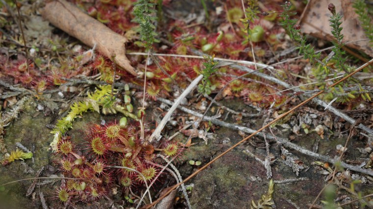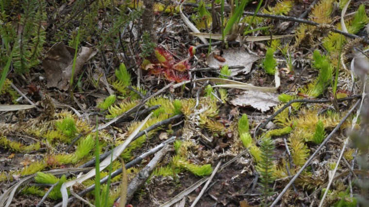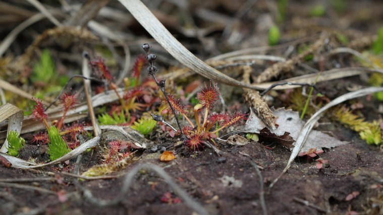 Ces Drosera rotundifolia et Drosera intermedia sont les espèces les plus couramment rencontrées. On les trouve dans des tourbières ou des landes acides, le point commun étant un sol très pauvre et constamment humide. J’ai pu photographier ces deux espèces ensemble dans une tourbière de la forêt de Rambouillet, en compagnie de sphaignes, de bruyères, de molinie et du rare Lycopodiella inundata (zyeutez cet article pour en savoir plus sur les incroyables lycopodes).