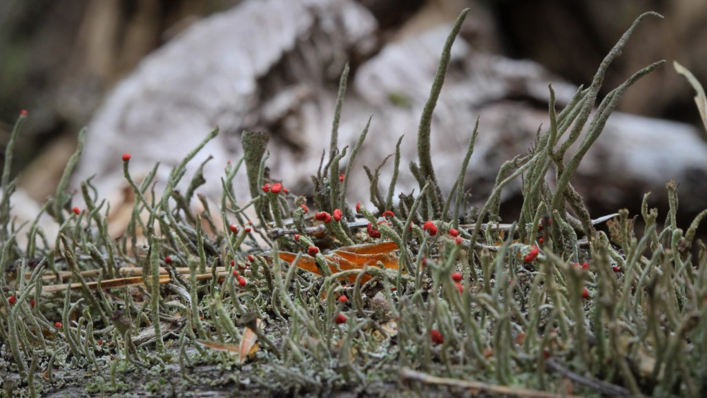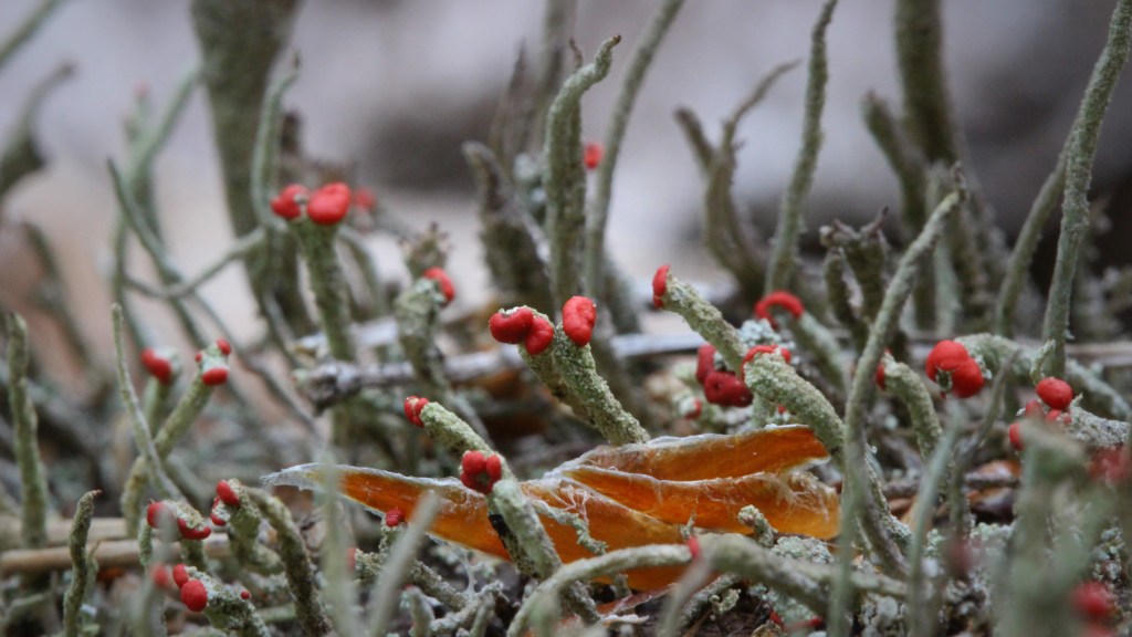 La seconde solution, plus complexe mais permettant un brassage génétique, est la reproduction sexuée. Celle-ci fait obligatoirement intervenir des organes spécialisés : des apothécies ou des périthèces. Sur ces photos, vous pouvez observer de nombreuses apothécies (en rouge) au sommet des ramifications du thalle (en gris) de ce lichen du genre Cladonia. Ces apothécies sont constitués d’asques (les cellules reproductrices) et de paraphyses (des filaments stériles). Les organes reproducteurs des lichens sont d’ailleurs très utiles pour permettre d’identifier et reconnaître les différentes espèces, souvent très ressemblantes.