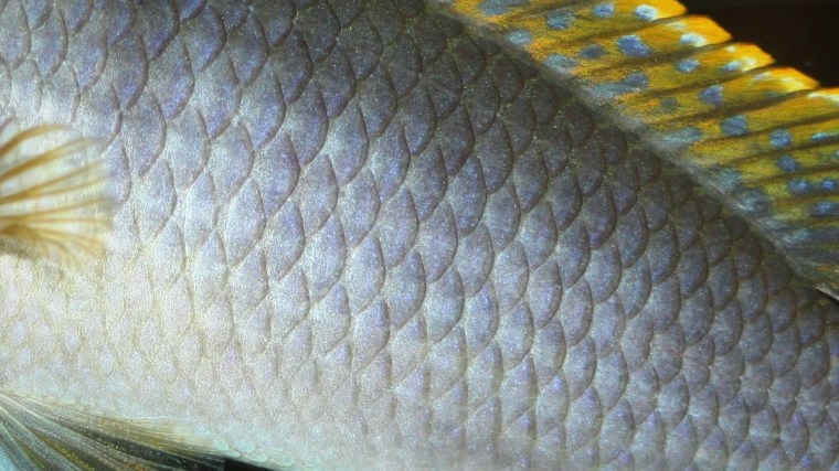 - écailles élasmoïdes de Labidochromis sp. ‘Hongi’ (Actinoptérygiens),